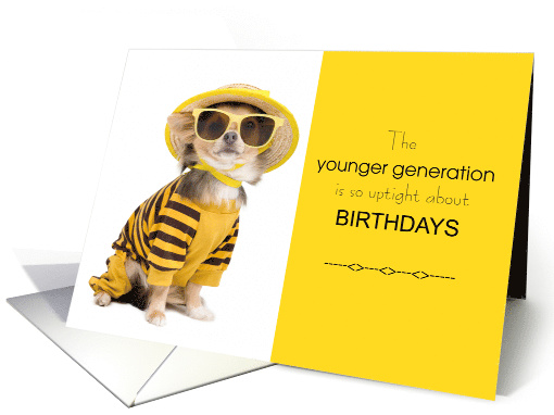 Everyone ages but some do it with more style and grace than others. Here's a fun birthday card with a chihuahua touting the wisdom of those who have seen quite a few birthdays and instead of being uptight like the younger generation, they embrace it and step out in style. Sassy and fun!