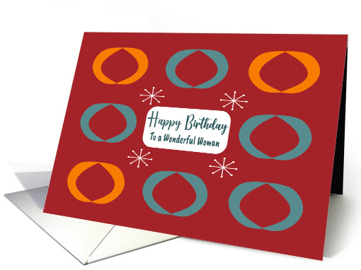Give a wonderful Woman this retro Mid-Century Modern birthday greeting card to wish her an enjoyable birthday. This charming design features a classic oval and star pattern against a red background, paying tribute to the past.