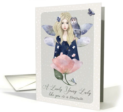 | Artist Notes: | A young lady in your life is sure to love this magical birthday greeting featuring a pretty teen girl with fairy wings, an owl on her shoulder, a butterfly, a dragonfly and flowers. |