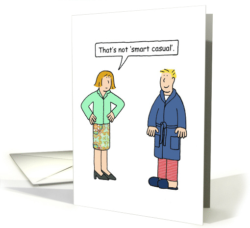 A cartoon of a couple. The man is wearing a dressing gown, pj's and a pair of slippers. The woman is telling him that his outfit is not 'smart casual'. Inside the card says 'Happy Birthday!' 'Remember to slip into something fabulous for the celebrations.'