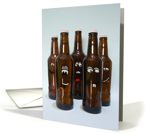 This humorous card featuring five beer bottles with funny illustrated faces on a light blue background, would be sure to make any "beer lover" smile. The inside reads "Happy BEERthday!" Photo and illustration by designer.