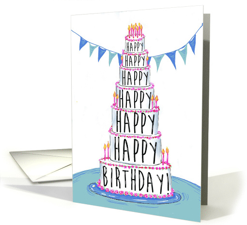 A festive cake on a turquoise table proclaims Happy, Happy, Happy, Happy, Happy, Happy Birthday on each of its layers. Behind it, festive blue and mint green pennants hang. Celebrate, you deserve it! is the message inside.