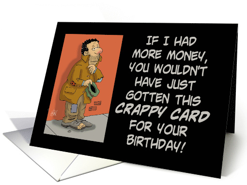 Humorous birthday card with a cartoon showing a man panhandling on the street. The words say, If I had more money, you wouldn't have just gotten this crappy card for your birthday! Inside says, I'd have gotten you a nicer card! Happy Birthday
