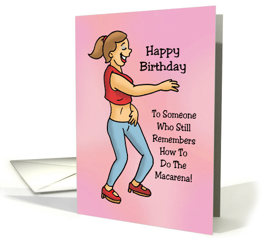 Humorous Birthday card with a cartoon woman and the words: Happy birthday to someone who still remembers how to do the macarena! Inside says: And probably still does it after a few drinks!