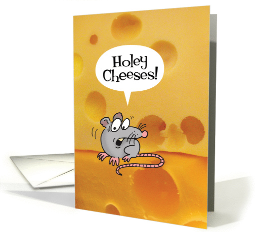 Artist Notes: | Cute cartoon of a mouse sitting on a stack of cheeses, looking shocked as he says, "Holey cheeses!" "Holey" because the Swiss cheese (photo) has holes in it. The inside continues with more puns... "You're a year older and you haven't aged. Gouda for you! Happy Birthday!" |