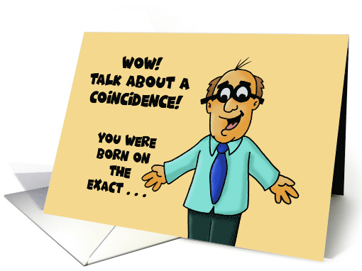 Humorous Birthday card with a cartoon man on a yellow background. The words say: Talk about a coincidence! You were born on the exact . . . Inside says: . . . date of your birthday! Happy Birthday