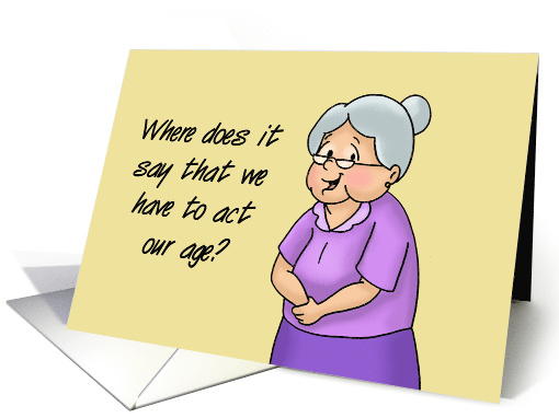 Artist Notes: | Birthday card with a cartoon older woman on a goldish background. The words say: Where does it say that we have to act our age? Inside says: As long as it makes us happy, and we're not hurting anyone, we can act whatever age we want! Happy Birthday |