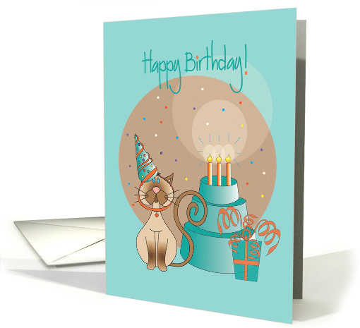 This little kitty wants to help you wish a very special someone who loves cats, a very happy birthday. She has constructed a birthday cake out of three of her dishes, stacking them up like a cake, with three candles at the top. A wrapped gift sits in front of the cake, while she wears her party hat that has orange, purple, yellow and blue polka dots covering it. The wording, at the top of the teal colored card, says "Happy Birthday!" in hand lettering, while confetti fills the air all around the kitten and her party scene. The card's inside wording is "Stacking up wishes for a joyous birthday for you!"