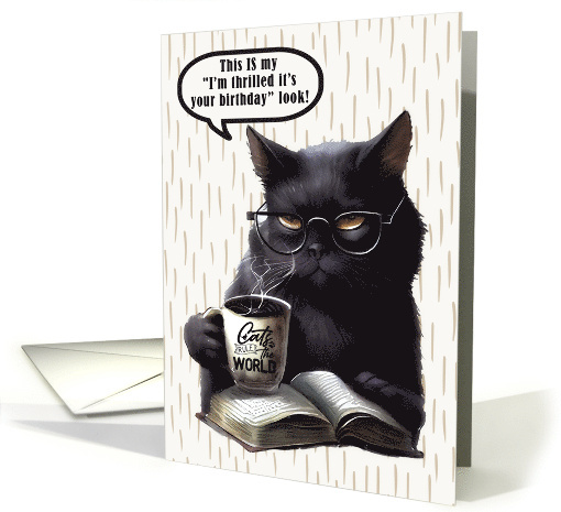 Give humorous birthday greetings with this black cat looking and sounding very disinterested about the birthday. The cat is wearing glasses, reading a book, and holding a mug with the word art "Cats rule the world".