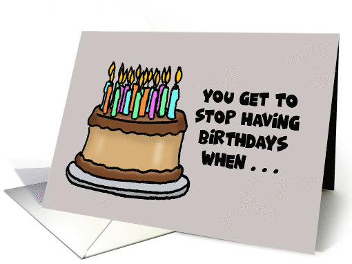 Humorous Birthday card with a cartoon cake with many candles, on a gray background. The words say: You get to stop having birthdays when . . . Inside says: . . . the candles no longer fit on the cake! Happy Birthday
