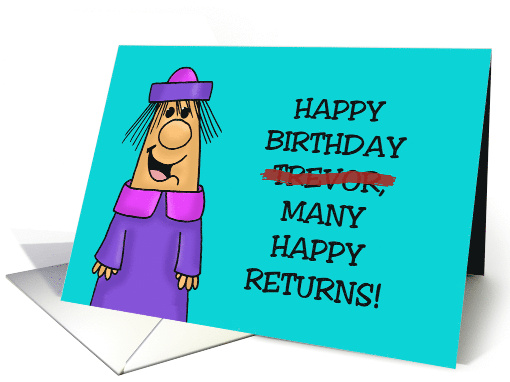 Funny Birthday Card with a cartoon character on an aqua background. The words say: Happy birthday (name crossed out) many happy returns! Inside says: Hope you don't mind that I recycled an old card! Just doing my part for the environment!