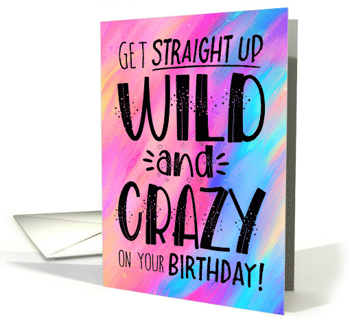 Wish someone a happy birthday with this fun, modern typography design featuring the message, "Get STRAIGHT UP WILD and CRAZY on your Birthday!" Includes type accents, stars and underlines on brightly colored, painted watercolor background. Inside can be customized with your own message.
