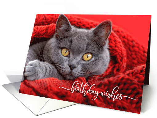 | Title: | Birthday Wishes Gray British Shorthair Cat in a Red Blanket |