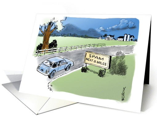 I hope the birthday celebrant opens this card before they chuck it with the other junk mail ... The SPAM sign shown in the cartoon leads to the spam Happy Birthday message inside. The original art is my creation.