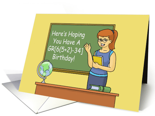 Humorous Math Joke Birthday card with a cartoon teacher at a chalkboard. The words say: Here's hoping you have a GR[6(5+2)-34] birthday! (the answer to the problem is 8, so it's GR8 or great) Inside says: No problem!