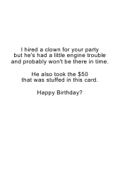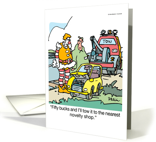 A clown has tiny car trouble and calls for a tow truck. The tow truck driver offers to tow it to the nearest novelty shop for $50. Inside reads, Happy Birthday! Sorry I can't be there, I've had a little car trouble. Great excuse and greeting for anyone on your list with a love (or fear) of clowns and a sense of humor! Thanks for checking out my greeting cards. More cards: http://www.greetingcarduniverse.com/community/store.asp?store_id=2337&gcu=42744787710&mid=cwu Cornered Books at: https://www.amazon.com/-/e/B007G2B9BO My daily cartoon: https://www.gocomics.com/cornered