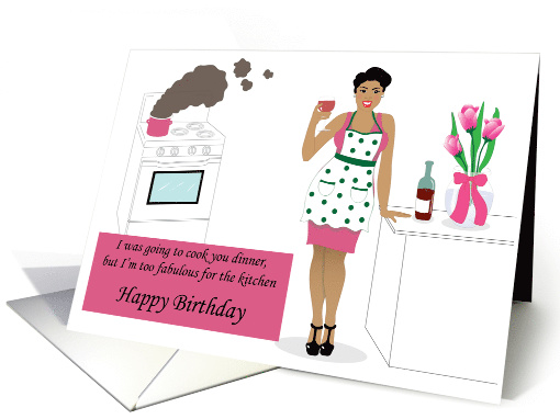 This birthday card shows a beautiful, curvy, and elegant black (African American) woman having wine in the kitchen while food on the stove is burning. She is wearing a pink dress, black shows, and a white apron with green dots. There's a bottle of wine and pink tulips on the kitchen counter. The front read, I was going to cook you dinner, but I'm too fabulous for the kitchen - Happy Birthday.