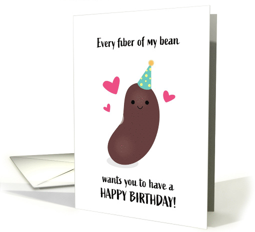 Cute and punny birthday card featuring a little brown bean wearing a green polka dot party hat and surrounded by hearts is perfect for any person that loves food and puns.