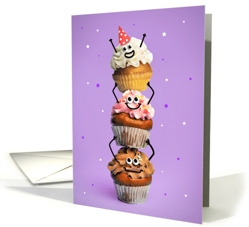 Celebrate a sweet birthday with this adorable card featuring a stack of smiling cupcake characters holding each other up, topped with a party hat and star confetti on a purple background. Fun and festive for all ages!