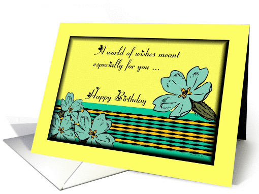 Pretty Primrose flowers makes a beautiful Birthday Card for all of those happy birthday greetings you send. Card with primrose flowers on a blue and yellow diamond background.