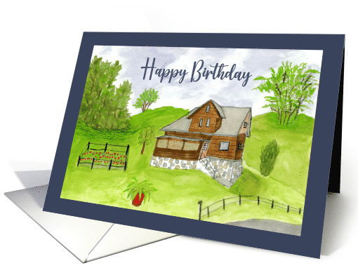 Happy Birthday General House Landscape Garden Trees Farm Watercolor