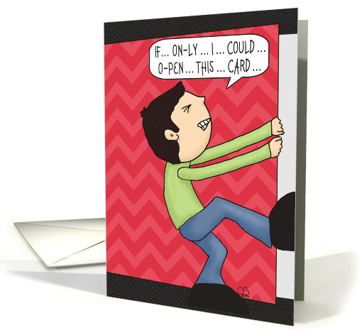 ©Christie Black. A cartoon man grasps the front of a large card and the word bubble shows his struggle as he tries to open it and wish the recipient a Happy Birthday. Card has a muted red and pink chevron pattern.