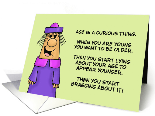 Humorous Birthday card with a cartoon character on a green background. The words say: Age is a curious thing. When you are young you want to be older. Then you start lying about your age to appear younger. Then you start bragging about it! Inside says: Whatever age you are, just enjoy it! Happy Birthday