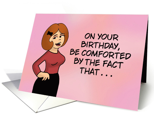 Funny Birthday Card with cartoon woman on a pinkish background. The words say: On your birthday, be comforted by the fact that . . . The inside says: . . . many people our age look older than us!