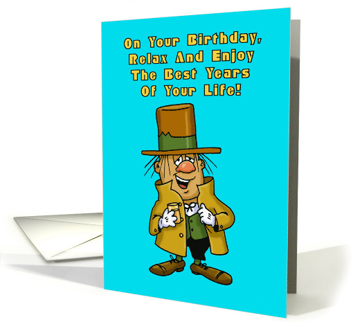 Humorous Birthday Card with a cartoon character on a blue background. the words say, On your birthday, relax and enjoy the best years of your life! Inside says, Of course that means it's all downhill from here! Happy Birthday
