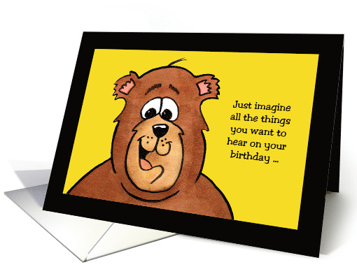 Humorous Birthday Card with a cartoon bear and the words:Just imagine all the things you want to hear on your birthday ... Inside says: ... and assume I said them. Happy Birthday