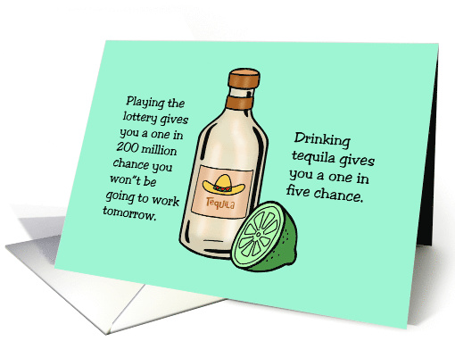 Humorous Birthday card, with a cartoon of a bottle of tequila and a lime. The words say: Playing the lottery gives you a one in 200 million chance you won't be going to work tomorrow. Drinking tequila gives you a one in five chance. Inside says: So, will it be scratchers or slots on your birthday?
