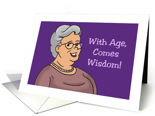 Humorous Birthday card with a cartoon of an older woman and the words: With age comes wisdom! Inside says: It will happen one of these days, trust me! Happy Birthday