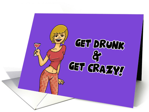 Humorous Birthday card with a cartoon woman on a purple background. The words say: Get Drunk & Get Crazy! Inside says: I meant, have a nice birthday!