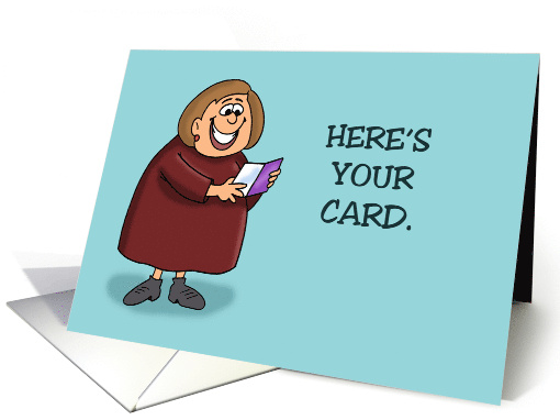 Humorous Birthday card with a cartoon woman holding a card on a blue background. The words say: Here's your card. Inside says: You'll probably get another one from me in 365 days. Happy Birthday