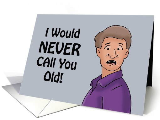 Humorous Birthday card with a cartoon of a man on a gray background. The words say: I would never call you old! Inside says: Elderly, decrepit, feeble, on your last legs, sure. But not old. Happy Birthday