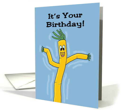 Humorous Birthday card with a drawing of a dancing inflatable balloon man, on a sky blue background. The words say: It's your birthday! Inside says: Cut loose!