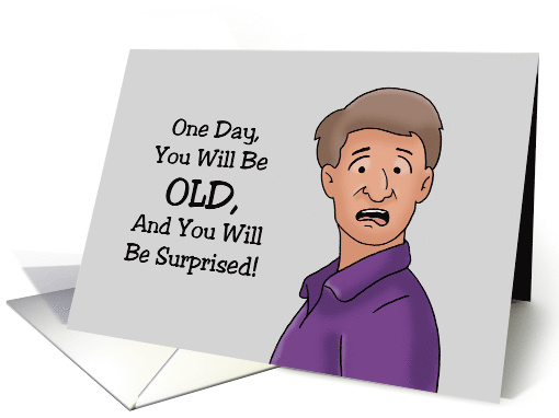 Artist Notes: | Humorous Birthday Card with a cartoon shocked man on a gray background. The words say: One day you will be old, and you will be surprised! Inside says: Because no one sees it coming! Happy Birthday! |