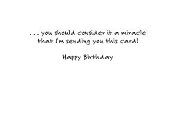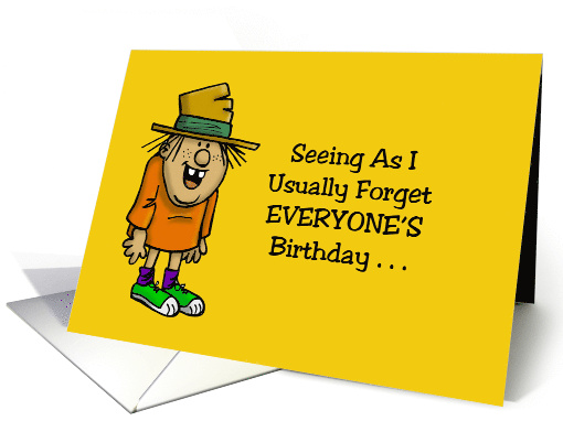 Humorous Birthday card, with a cartoon character on a yellow background. The words say: Seeing as I usually forget everyone's birthday . . . Inside says: . . . you should consider it a miracle that I'm sending you this card! Happy Birthday