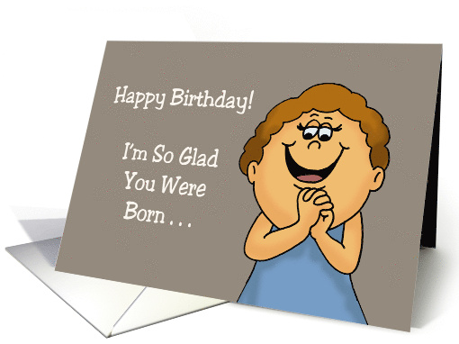 | Artist Notes: | Humorous Birthday card with a cartoon woman looking happy, on a gray background. The words say: Happy birthday! I'm so glad you were born . . . ! Inside says: . . . my life would be so boring without you! |