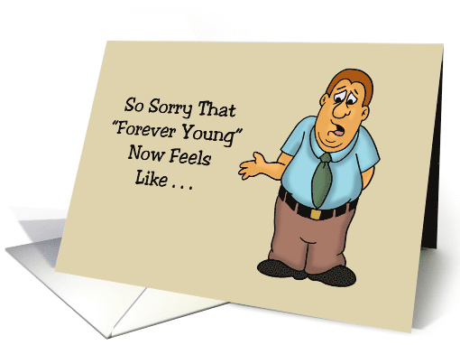 Humorous Birthday Card with a cartoon character on a tan background. The words say: So sorry that "forever young" now feels like . . . Inside says: . . . forever exhausted! Happy Birthday