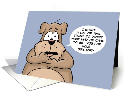 Humorous Birthday Card with a nervous cartoon dog on a blue-gray background. The words say: I spent a lot of time trying to decide what kind of card to get you for your birthday! Inside says: I finally gave up and settled on a birthday card.