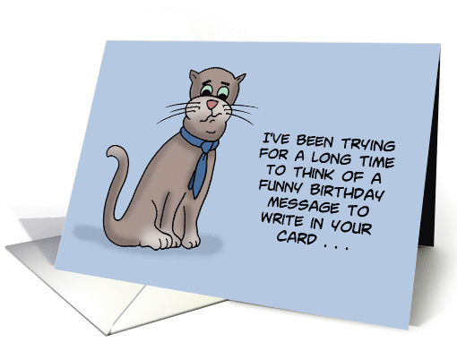 Humorous Birthday card with a cartoon cat on a blue-gray background. The words say: I've been trying for a long time to think of a funny message to write in your card . . . Inside says: . . . but I couldn't think of anything. Happy Birthday