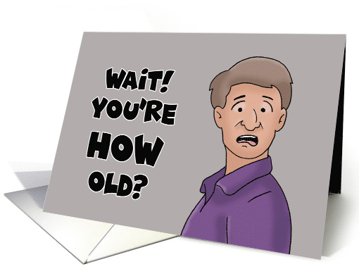 Humorous Birthday Card with a cartoon man on a gray background. The words say: Wait! You're HOW old? Inside says Sorry, I meant to say "Happy Birthday".