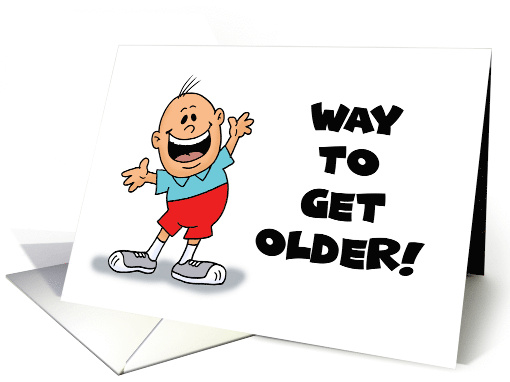 Humorous Birthday card with a cartoon character on a white background. The words say: Way to get older! The inside says: I knew you could do it! Happy Birthday