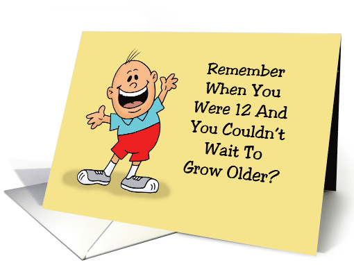 | Artist Notes: | Humorous Birthday card with a cartoon boy on a yellow background. The words say: Remember when you were 12 and you couldn't wait to grow older? Inside says: How's that working out for you so far? Happy Birthday |