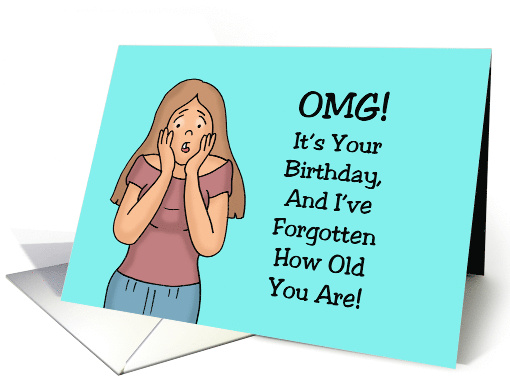 Humorous Birthday Card with a cartoon woman on a light blue background. The words say: OMG! It's your birthday, and I've forgotten how old you are! Inside says: Remind me again, how old you're pretending to be!