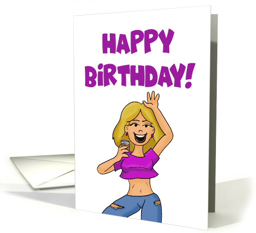 Humorous Birthday card with a cartoon woman partying on a white background. The words say: Happy Birthday! Inside says: The only thing getting old around here, is that phrase!