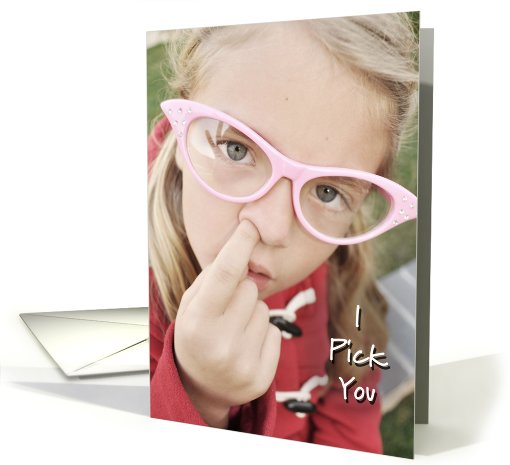 Funny photograph of a little girl with her finger up her nose, picking you to have a happy birthday.