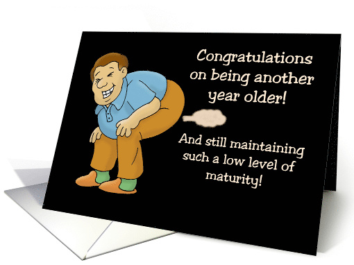 Rude Birthday card with a cartoon of a man farting. The words on a black background say, Congratulations on being another year older! And still maintaining such a low level of maturity! Inside says, You are truly an inspiration to us all! Happy Birthday
