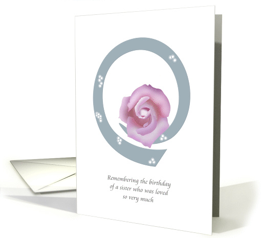 | Artist Notes: | In the first year after the passing of a sister who was loved, we are remembering the birthday. This design features a muted blue colored curve decorated with geometric white colored spheres. Resting on the curve we have a beautiful lilac colored rose. |